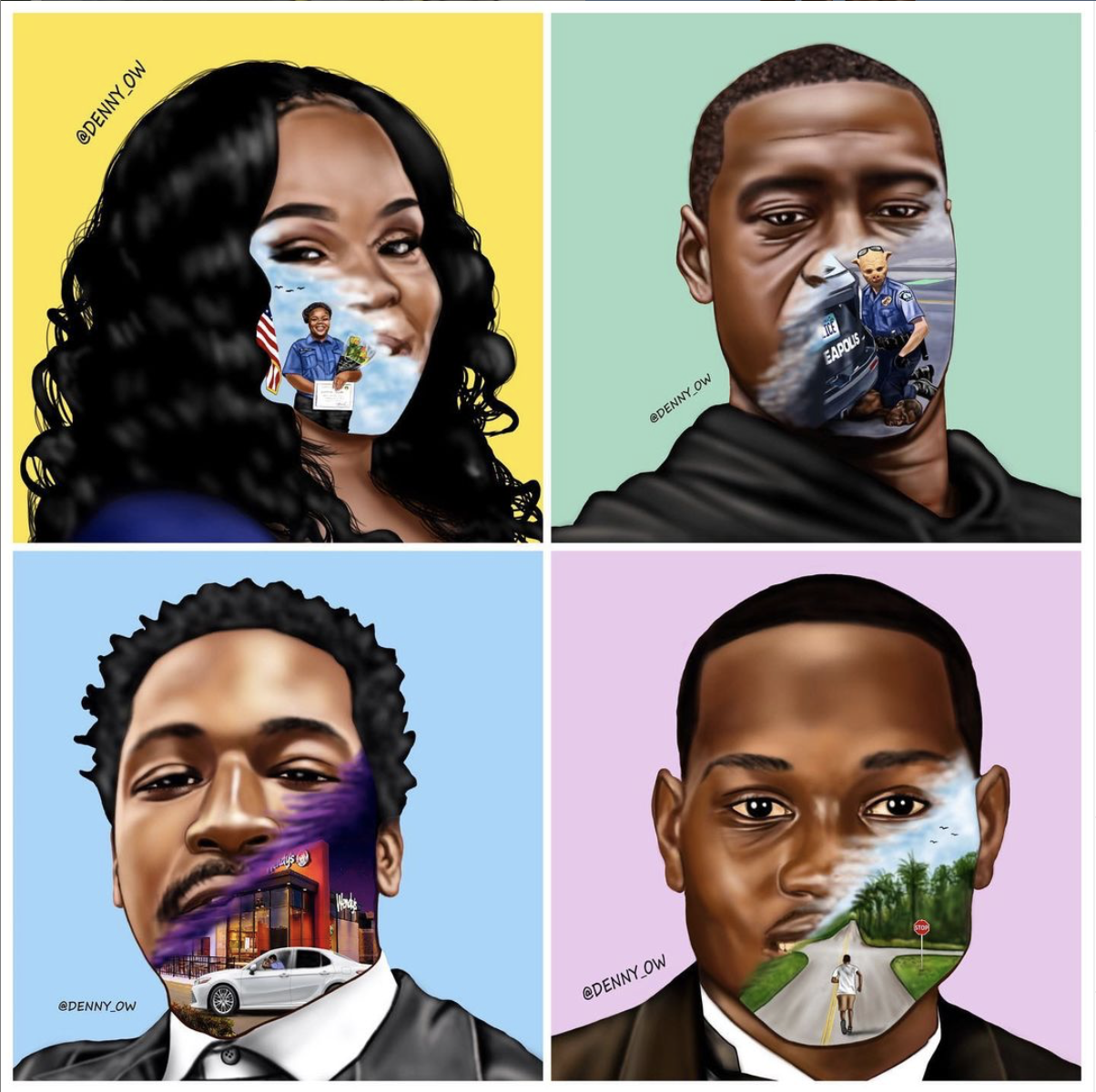 Denny-ow has been creating abstract portraits of the different victims of police brutality. In his images half of their face displays the ordinary activities they were doing before they were killed. The images include, (Ahmaud Arbery) jogging or (Elijah McClain) walking home, while others display casual snippets of their life, like Breonna Taylor smiling and holding flowers at what appears to be an enrollment. His artwork shines a light on the lives lived alongside the unjust way they were murdered. As a result, viewers can never look at his artwork and forget a part of their story.